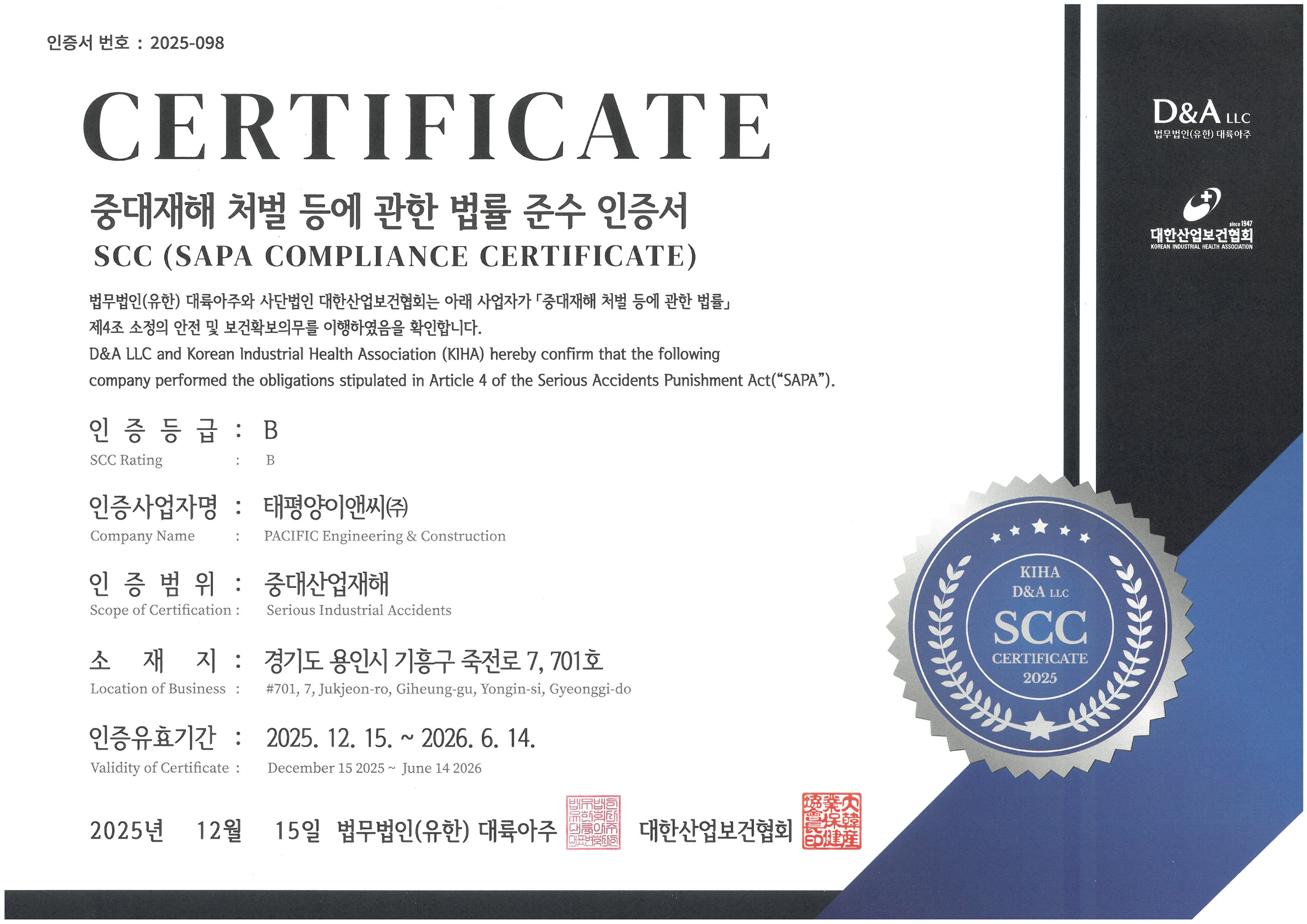 중대재해 처벌등에 관한 법률 준수 인증서(SSC) 취득